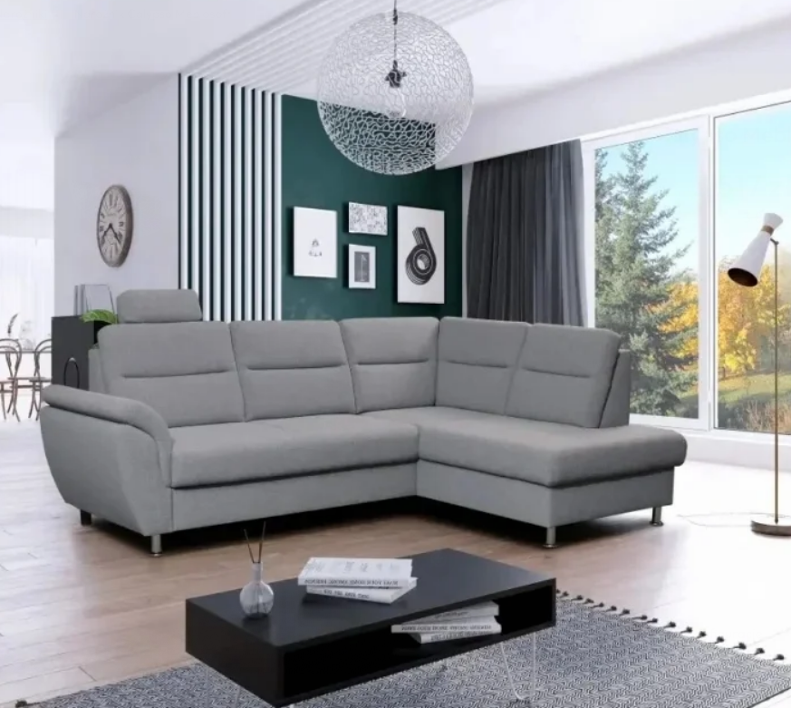 Narożnik Calypso Meblosoft o wymiarach: szerokość 246cm, głębokość 175cm, wysokość 90cm a z zagłówkiem 106cm, to nowoczesny narożnik z funkcją spania, który doskonale sprawdzi się w salonie. Dzięki mechanizmowi delfin rozkładanie narożnika jest szybkie i wygodne, co umożliwia stworzenie komfortowej powierzchni spania o wymiarach 185×118 cm. Wysuwana funkcja jest również wyposażona w sprężyny. Dodatkowym atutem jest pojemnik na pościel, który zapewnia dodatkowe miejsce do przechowywania.