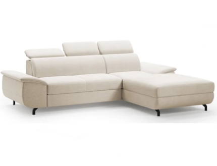Wysokie oparcie, szeroki podłokietnik i regulowane zagłówki umożliwiają dopasowanie pozycji siedzenia do indywidualnych preferencji. Metalowe stopki w kolorze czarnym nadają meblowi lekkości i nowoczesnego wyrazu. Wyważone proporcje konstrukcji sprzyjają komfortowi zarówno podczas siedzenia, jak i odpoczynku w pozycji leżącej.