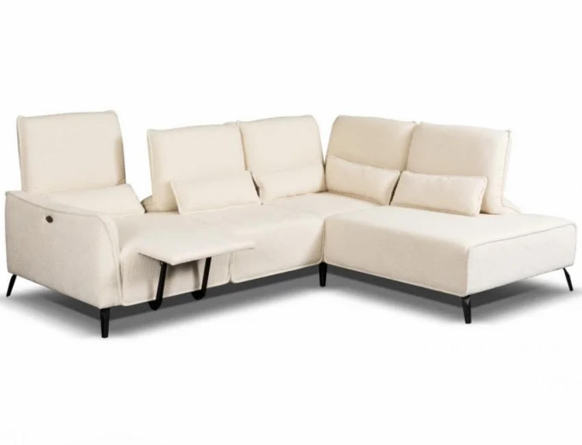 Mebel oferuje szerokość 260 cm, głębokość 208 cm oraz wysokość 94 cm do 102cm przy rozłożonych oparciach co czyni go odpowiednim rozwiązaniem zarówno do przestronnych salonów, jak i starannie zaprojektowanych stref dziennych. Dla osób potrzebujących dodatkowego miejsca do spania, istnieje możliwość stworzenia powierzchni 230×158 cm – wystarczy dokupić dużą pufę Modern, dostępną jako oddzielny element.