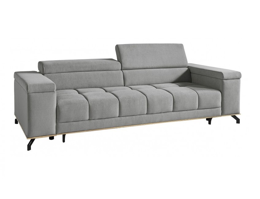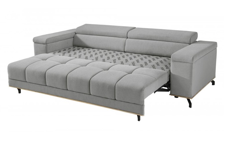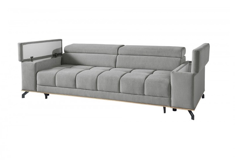 Pikowane siedzisko nadaje sofie nowoczesnego charakteru. Poziome cięcia na poszczególnych elementach sprawiają, że mebel mimo swoich dużych gabarytów wydaje się lekki i rozłożysty. Dzięki zastosowaniu podwójnego sprężynowania – sprężyna falista i bonell – uzyskano wysoki komfort użytkowania. W podłokietnikach znajdują się pojemniki na pościel.