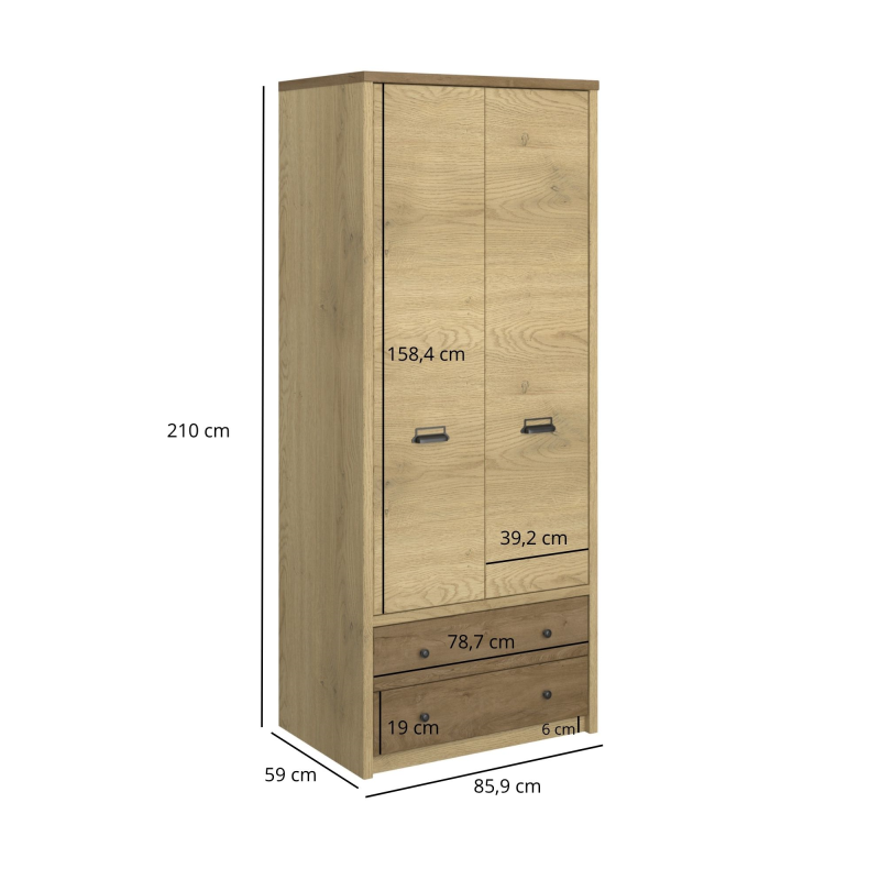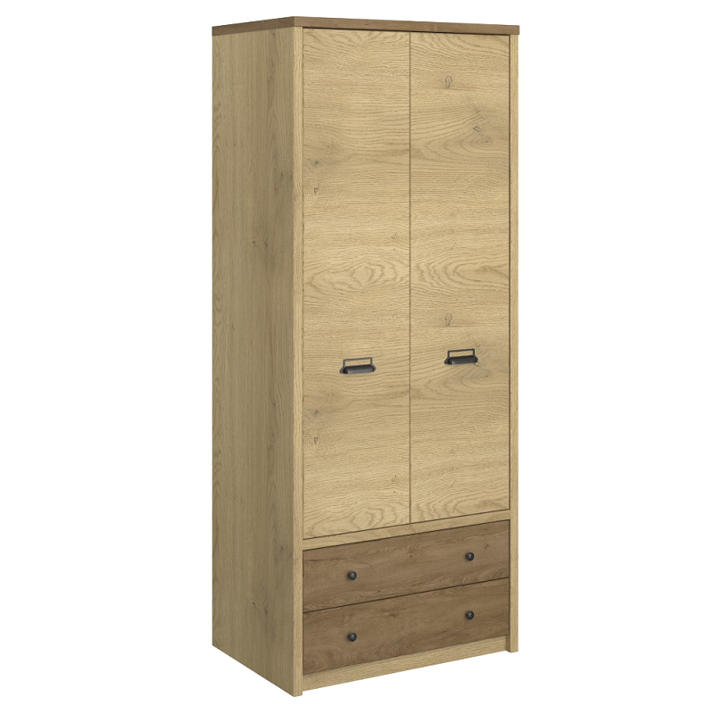 Szafa Denzel 2d2s to połączenie prostoty i praktyczności w loftowym wydaniu. Kolory dąb cremona i dąb lefkas tworzą ciepły kontrast, a metalowe uchwyty podkreślają nowoczesny charakter mebla. Dwie pojemne szuflady i przestrzeń z drążkiem sprawiają, że to idealna szafa do pokoju młodzieżowego lub sypialni. Jej elegancki wygląd wprowadza do wnętrza harmonię i styl.